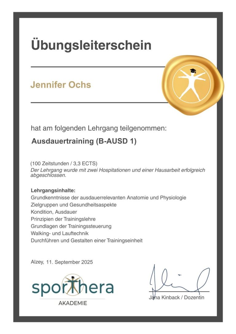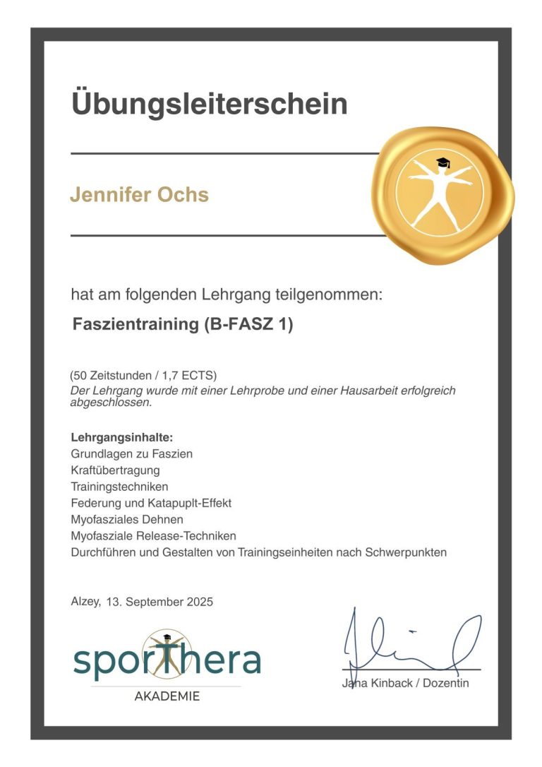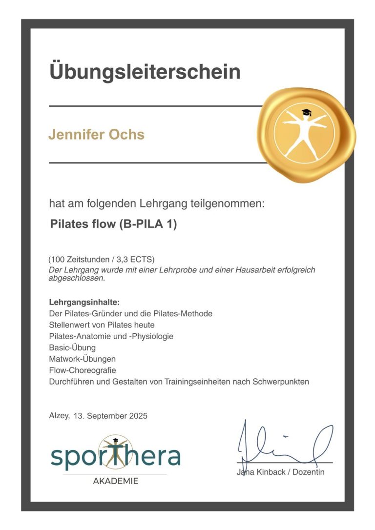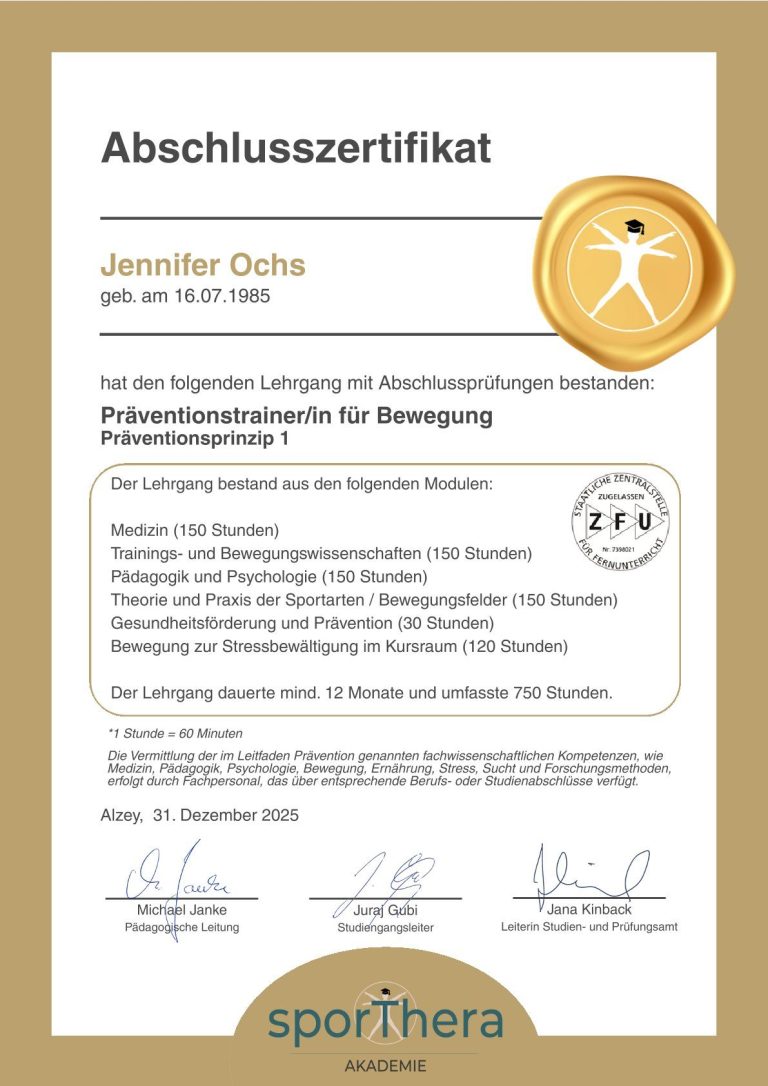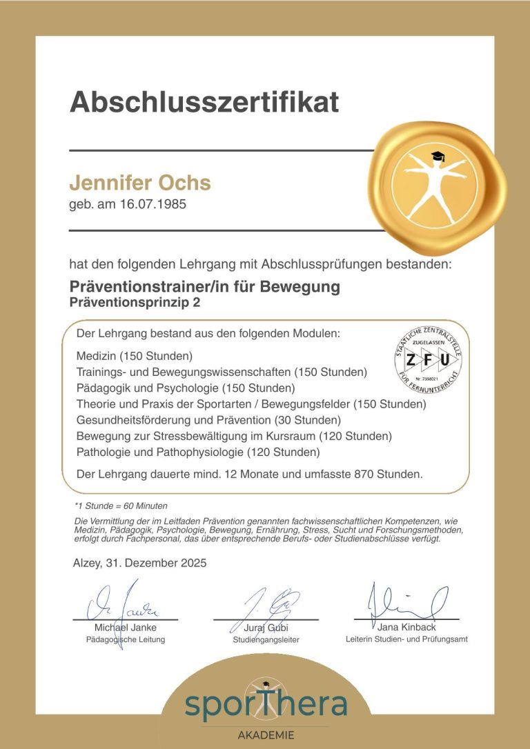 Seit Januar 2026 bin ich zertifizierte Präventionstrainerin im Handlungsfeld Bewegung Prinzip 1 + 2 und darf Gesundheitskurse mit Krankenkassenbezuschussung anbieten.